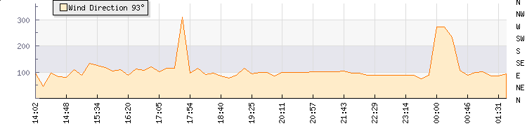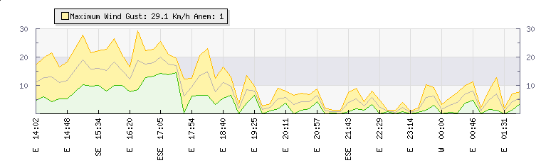 In the last few minutes the wind was South Westerly at an average speed of 4 kmh, reaching up to 7 kmh and a low of 0 kmh. The gust strength is7 kmh above the minimum speed |