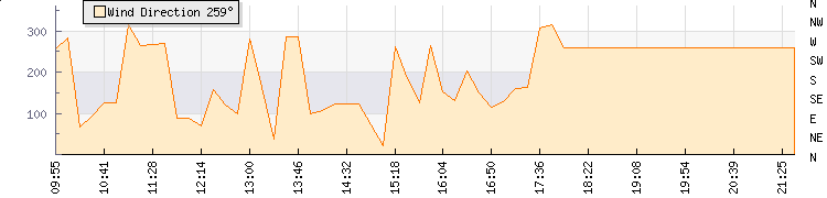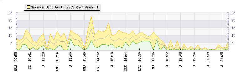 In the last few minutes the wind was Westerly at an average speed of 0 kmh, reaching up to 0 kmh and a low of 0 kmh. The gust strength is0 kmh above the minimum speed |