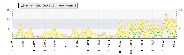 In the last few minutes the wind was Easterly at an average speed of 1 kmh, reaching up to 1 kmh and a low of 0 kmh. The gust strength is1 kmh above the minimum speed |