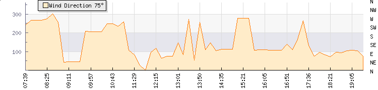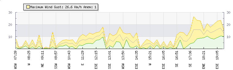 In the last few minutes the wind was Easterly at an average speed of 16 kmh, reaching up to 23 kmh and a low of 8 kmh. The gust strength is15 kmh above the minimum speed |
