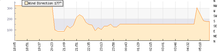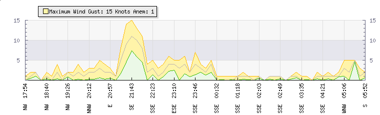 In the last few minutes the wind was West South West at an average speed of 2 knots, reaching up to 5 knots and a low of 0 knots. The gust strength is5 knots above the minimum speed |