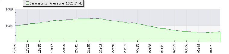 | Wind Speed: | 0|3|6 kmh | Wind Direction: | SSE 149° | Temperature: | 19.2°C | | Wet Bulb: | 17.6°C | Discomfort: | 79 | Humidity: | 87% | | Rainfall Today: | 0mm | 12 hrs Rainfall: | 0mm | 24 hrs Rainfall: | 0mm | | Barometer: | 1082.5mb | Dew Point: | 17°C | Clouds AGL: | 888ft (271 m) | | Density-Alt: | -1552ft (-473 m) | Fire Danger: | |
