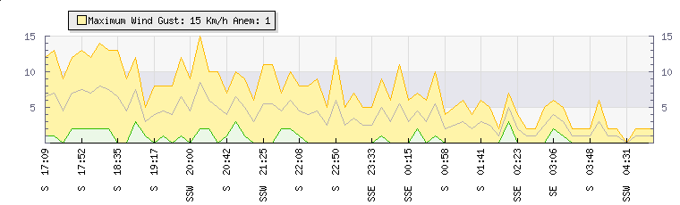 In the last few minutes the wind was South South East at an average speed of 3 kmh, reaching up to 6 kmh and a low of 0 kmh. The gust strength is6 kmh above the minimum speed |