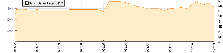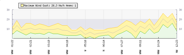In the last few minutes the wind was West North West at an average speed of 9 kmh, reaching up to 13 kmh and a low of 5 kmh. The gust strength is8 kmh above the minimum speed |