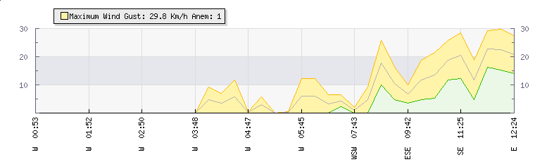 In the last few minutes the wind was East North East at an average speed of 3 kmh, reaching up to 6 kmh and a low of 0 kmh. The gust strength is6 kmh above the minimum speed |