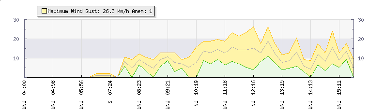 In the last few minutes the wind was West North West at an average speed of 4 kmh, reaching up to 9 kmh and a low of 0 kmh. The gust strength is9 kmh above the minimum speed |