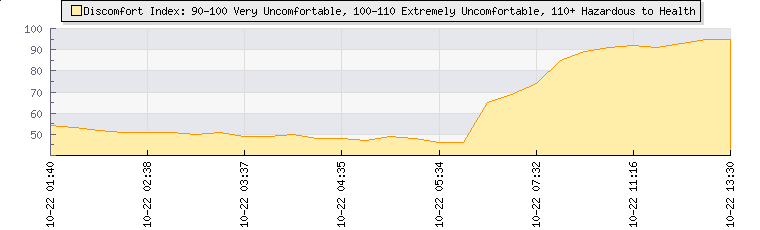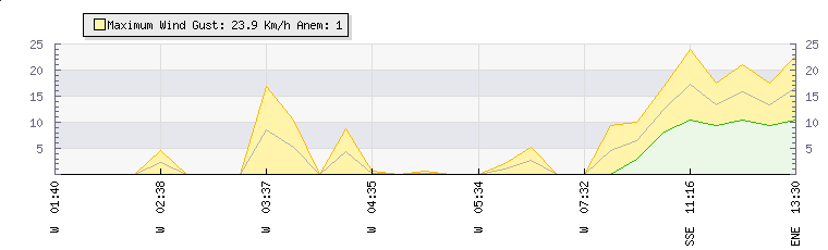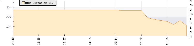 In the last few minutes the wind was Westerly at an average speed of 5 kmh, reaching up to 11 kmh and a low of 0 kmh. The gust strength is11 kmh above the minimum speed |