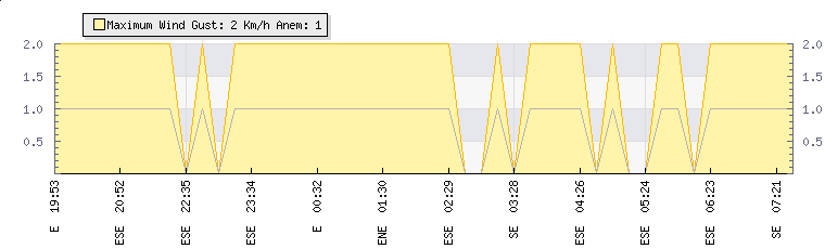 In the last few minutes the wind was East South East at an average speed of 0 kmh, reaching up to 0 kmh and a low of 0 kmh. The gust strength is0 kmh above the minimum speed |