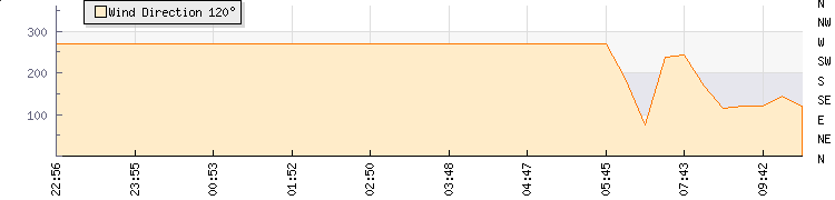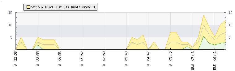 In the last few minutes the wind was Westerly at an average speed of 0 knots, reaching up to 0 knots and a low of 0 knots. The gust strength is0 knots above the minimum speed |