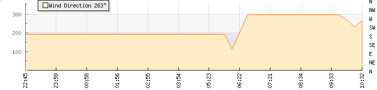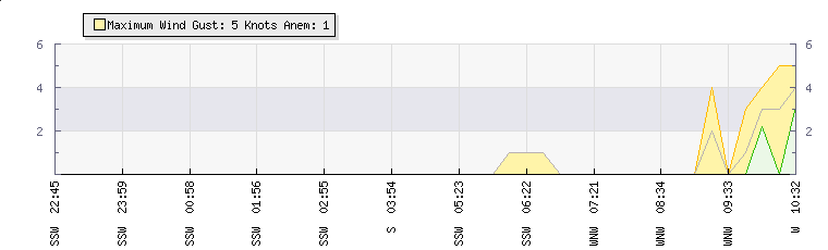 In the last few minutes the wind was West North West at an average speed of 0 knots, reaching up to 0 knots and a low of 0 knots. The gust strength is0 knots above the minimum speed |