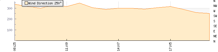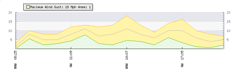 In the last few minutes the wind was West North West at an average speed of 6 mph, reaching up to 10 mph and a low of 1 mph. The gust strength is9 mph above the minimum speed |