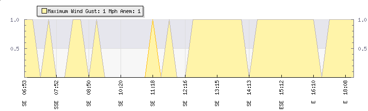 In the last few minutes the wind was Easterly at an average speed of 0 mph, reaching up to 0 mph and a low of 0 mph. The gust strength is0 mph above the minimum speed |