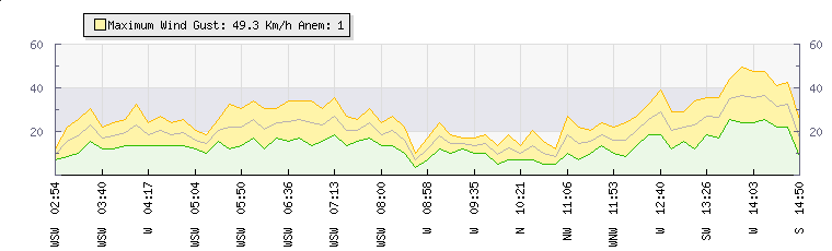 In the last few minutes the wind was North Westerly at an average speed of 19 kmh, reaching up to 24 kmh and a low of 14 kmh. The gust strength is10 kmh above the minimum speed |