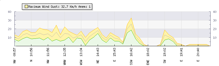 In the last few minutes the wind was South Easterly at an average speed of 1 kmh, reaching up to 2 kmh and a low of 0 kmh. The gust strength is2 kmh above the minimum speed |