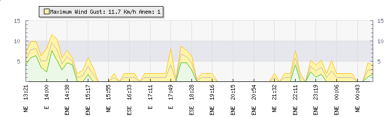 In the last few minutes the wind was East North East at an average speed of 3 kmh, reaching up to 5 kmh and a low of 0 kmh. The gust strength is5 kmh above the minimum speed |