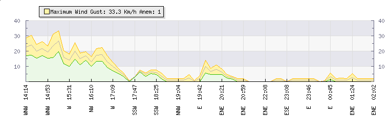 In the last few minutes the wind was East South East at an average speed of 1 kmh, reaching up to 1 kmh and a low of 0 kmh. The gust strength is1 kmh above the minimum speed |