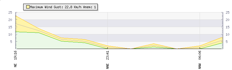 In the last few minutes the wind was North North West at an average speed of 1 kmh, reaching up to 2 kmh and a low of 0 kmh. The gust strength is2 kmh above the minimum speed |