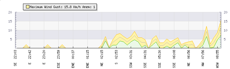 In the last few minutes the wind was Westerly at an average speed of 9 kmh, reaching up to 12 kmh and a low of 6 kmh. The gust strength is6 kmh above the minimum speed |
