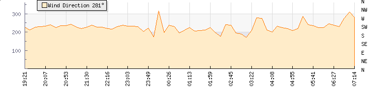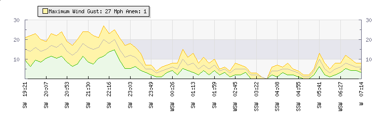 In the last few minutes the wind was South South West at an average speed of 5 mph, reaching up to 8 mph and a low of 2 mph. The gust strength is6 mph above the minimum speed |