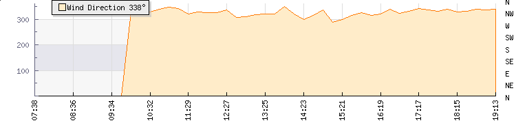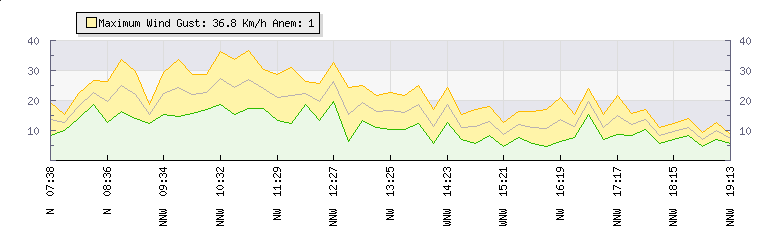 In the last few minutes the wind was North Westerly at an average speed of 12 kmh, reaching up to 16 kmh and a low of 8 kmh. The gust strength is8 kmh above the minimum speed |
