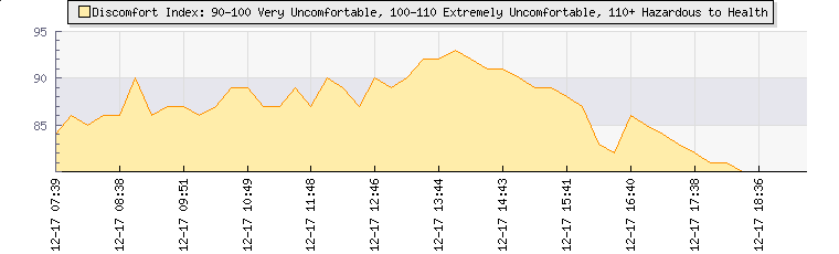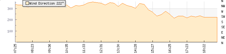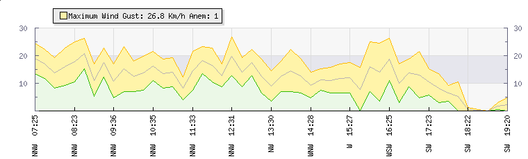 In the last few minutes the wind was South Westerly at an average speed of 11 kmh, reaching up to 15 kmh and a low of 6 kmh. The gust strength is9 kmh above the minimum speed |