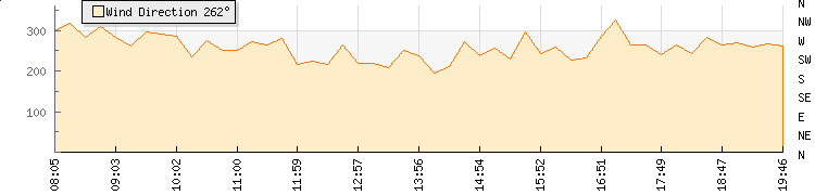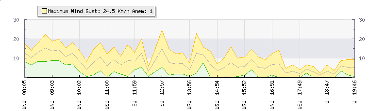 In the last few minutes the wind was Westerly at an average speed of 4 kmh, reaching up to 6 kmh and a low of 2 kmh. The gust strength is4 kmh above the minimum speed |