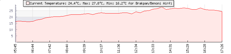 | GPS Co-ordinates: | S 26º 14' 34, E 28º 18' 02 | | ASL: | 5446 feet | | Sunrise / Sunset: | 05:24 / 19:04 | | Beaufort Scale: | Gentle Breeze |