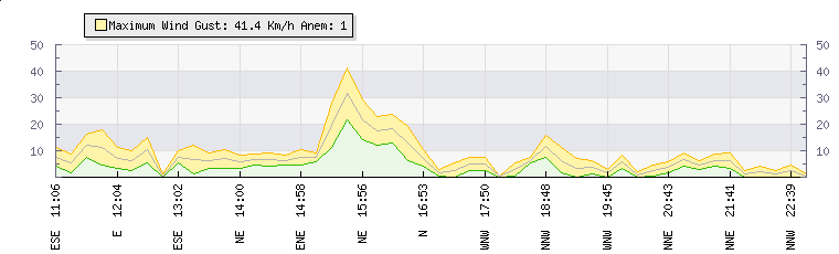 In the last few minutes the wind was North North East at an average speed of 1 kmh, reaching up to 2 kmh and a low of 0 kmh. The gust strength is2 kmh above the minimum speed |