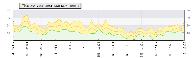 In the last few minutes the wind was Easterly at an average speed of 19 kmh, reaching up to 23 kmh and a low of 15 kmh. The gust strength is8 kmh above the minimum speed |