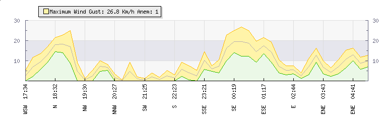 In the last few minutes the wind was East North East at an average speed of 7 kmh, reaching up to 11 kmh and a low of 3 kmh. The gust strength is8 kmh above the minimum speed |