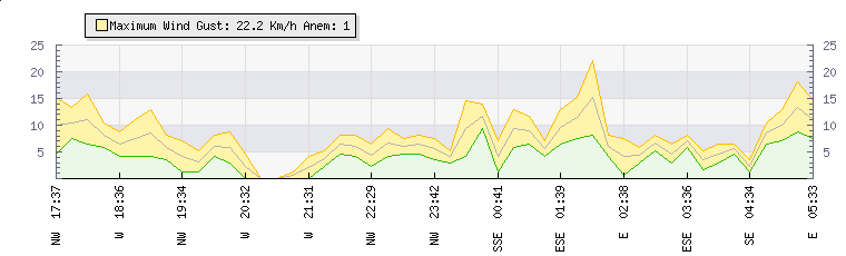 In the last few minutes the wind was East South East at an average speed of 7 kmh, reaching up to 8 kmh and a low of 6 kmh. The gust strength is2 kmh above the minimum speed |