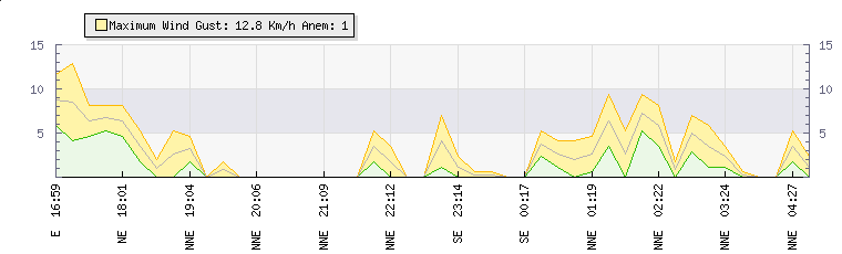 In the last few minutes the wind was North North East at an average speed of 4 kmh, reaching up to 6 kmh and a low of 1 kmh. The gust strength is5 kmh above the minimum speed |