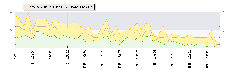 In the last few minutes the wind was North Easterly at an average speed of 2 knots, reaching up to 3 knots and a low of 1 knots. The gust strength is2 knots above the minimum speed |