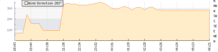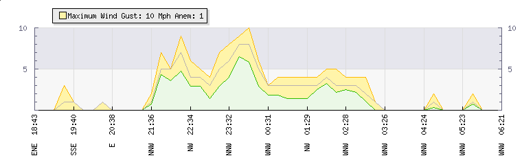 In the last few minutes the wind was West North West at an average speed of 0 mph, reaching up to 0 mph and a low of 0 mph. The gust strength is0 mph above the minimum speed |