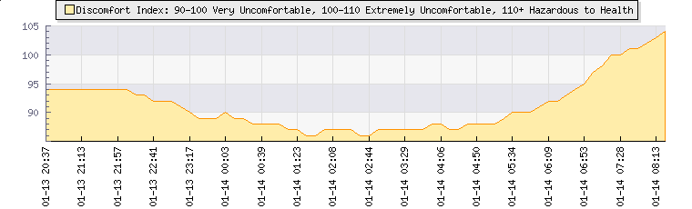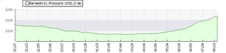 | Wind Speed: | 0|1|2 kmh | Wind Direction: | NNW 343° | Temperature: | 25.1°C | | Wet Bulb: | 22.1°C | Discomfort: | 94 | Humidity: | 78% | | Rainfall Today: | 0mm | 12 hrs Rainfall: | 0mm | 24 hrs Rainfall: | 0mm | | Barometer: | 1026mb | Dew Point: | 21°C | Clouds AGL: | 1646ft (502 m) | | Density-Alt: | 1335ft (407 m) | Solar Radiation: | 2251Wm² | Fire Danger: | |