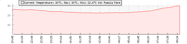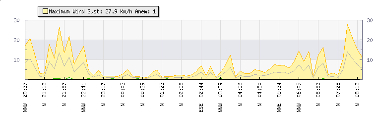| Wind Gust: | 14 km/h | Min Temp: | 22.4 °C | Max Temp: | 25.1 °C | | Wind Average: | 7 km/h | Min Hum: | 76 % | Max Hum: | 80 % | |  |