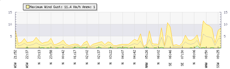 In the last few minutes the wind was East South East at an average speed of 5 kmh, reaching up to 11 kmh and a low of 0 kmh. The gust strength is11 kmh above the minimum speed |