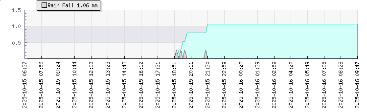 Wind Speed: | 0|5|11 kmh | Wind Direction: | ESE 123° | Temperature: | 17.9°C | Wet Bulb: | 16.1°C | Discomfort: | 75 | Humidity: | 85% | Rainfall Today: | 0mm | 12 hrs Rainfall: | 1.1mm | 24 hrs Rainfall: | 1.1mm | Barometer: | 1017.7mb | Dew Point: | 15.3°C | Clouds AGL: | 1024ft (312 m) | Density-Alt: | 689ft (210 m) | Solar Radiation: | 2251Wm² | Fire Danger: | |