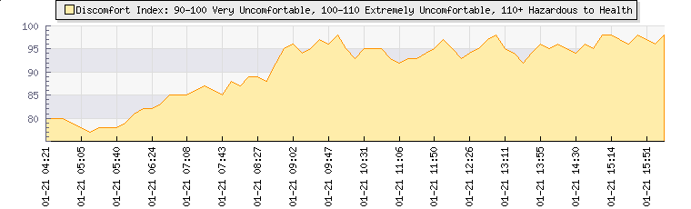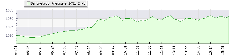 | Wind Speed: | 0|8|16 kmh | Wind Direction: | SE 143° | Temperature: | 27.5°C | | Wet Bulb: | 20.9°C | Discomfort: | 94 | Humidity: | 55% | | Rainfall Today: | 0mm | 12 hrs Rainfall: | 0mm | 24 hrs Rainfall: | 0.3mm | | Barometer: | 1029.1mb | Dew Point: | 17.6°C | Clouds AGL: | 3944ft (1202 m) | | Density-Alt: | 1440ft (439 m) | Solar Radiation: | 2251Wm² | Fire Danger: | |