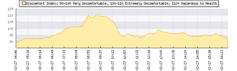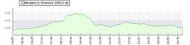 | Wind Speed: | 0|6|12 kmh | Wind Direction: | SSE 161° | Temperature: | 26°C | | Wet Bulb: | 22.2°C | Discomfort: | 95 | Humidity: | 72% | | Rainfall Today: | 0mm | 12 hrs Rainfall: | 0mm | 24 hrs Rainfall: | 0mm | | Barometer: | 1027.1mb | Dew Point: | 20.6°C | Clouds AGL: | 2181ft (665 m) | | Density-Alt: | 1398ft (426 m) | Solar Radiation: | 2251Wm² | Fire Danger: | |