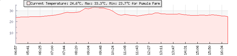 | Wind Gust: | 27 km/h | Min Temp: | 22.2 °C | Max Temp: | 33.3 °C | | Wind Average: | 14 km/h | Min Hum: | 61 % | Max Hum: | 81 % | |  |