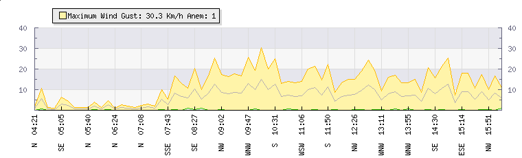 | Wind Gust: | 30 km/h | Min Temp: | 19 °C | Max Temp: | 29.5 °C | | Wind Average: | 15 km/h | Min Hum: | 52 % | Max Hum: | 82 % | |  |
