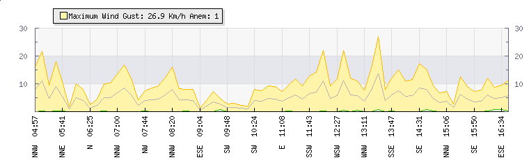 In the last few minutes the wind was South South East at an average speed of 6 kmh, reaching up to 12 kmh and a low of 0 kmh. The gust strength is12 kmh above the minimum speed |