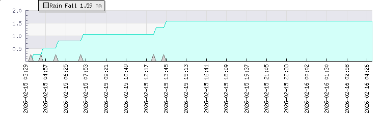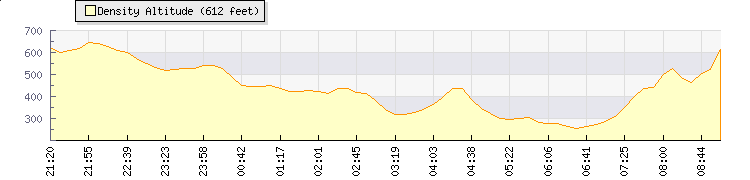 | Wind Speed: | 0|1|1 mph | Wind Direction: | E 91° | Temperature: | 19°C | | Wet Bulb: | 15.8°C | Discomfort: | 76 | Humidity: | 74% | | Rainfall Today: | 0mm | 12 hrs Rainfall: | 0mm | 24 hrs Rainfall: | 1.6mm | | Barometer: | 1018.7mb | Dew Point: | 14.2°C | Clouds AGL: | 1897ft (578 m) | | Density-Alt: | 764ft (233 m) | Solar Radiation: | 2251Wm² | Fire Danger: | |