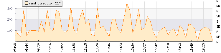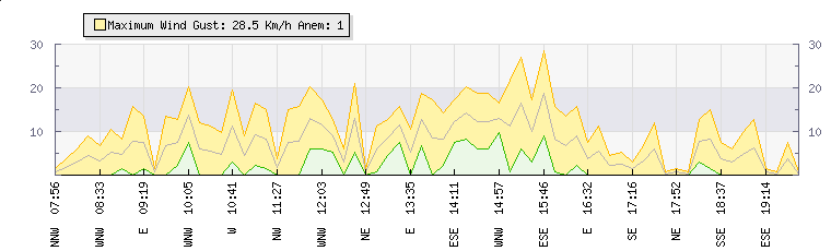 In the last few minutes the wind was North Easterly at an average speed of 6 kmh, reaching up to 11 kmh and a low of 0 kmh. The gust strength is11 kmh above the minimum speed |