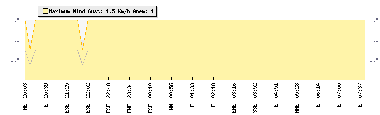 In the last few minutes the wind was Northerly at an average speed of 1 kmh, reaching up to 2 kmh and a low of 0 kmh. The gust strength is2 kmh above the minimum speed |