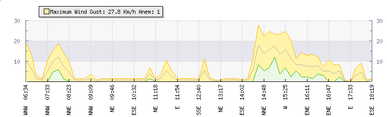 In the last few minutes the wind was Easterly at an average speed of 8 kmh, reaching up to 12 kmh and a low of 4 kmh. The gust strength is8 kmh above the minimum speed |
