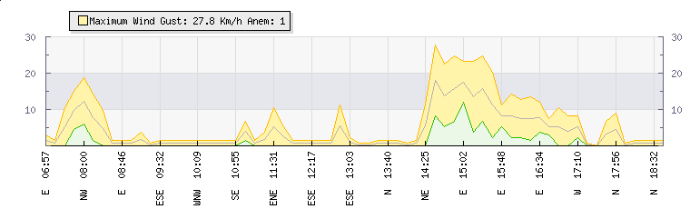 In the last few minutes the wind was East North East at an average speed of 5 kmh, reaching up to 11 kmh and a low of 0 kmh. The gust strength is11 kmh above the minimum speed |