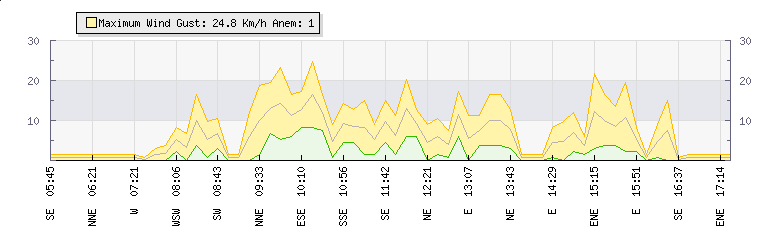 In the last few minutes the wind was Easterly at an average speed of 5 kmh, reaching up to 8 kmh and a low of 2 kmh. The gust strength is6 kmh above the minimum speed |