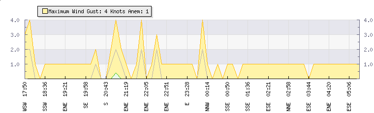 In the last few minutes the wind was North North East at an average speed of 1 knots, reaching up to 1 knots and a low of 0 knots. The gust strength is1 knots above the minimum speed |
